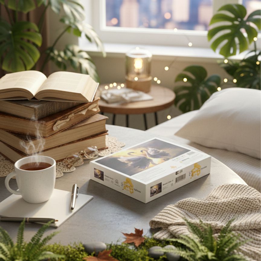 Immerse yourself in a moment of pure tranquility with the "Eternal Grace" Swan Jigsaw Puzzle. This stunning 1000-piece set features a breathtaking scene of two elegant white swans forming a heart against a golden sunset sky.